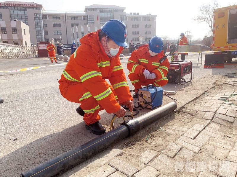 2月24日9时演练开始,北京燃气延庆公司调度室发现冬奥签约酒店新华家园附近中压管线压力异常,持续掉压,公司速派值班人员现场排查、处置,经核实研判,位于冬奥签约酒店新华家园南门西侧十字路口燃气中压A管线有漏点,影响附近74户居民。延庆公司第一时间启动燃气突发事件应急预案,派应急抢修人员在最短时间内赶赴现场,开展检测分析、确认管线位置、确定漏点、开挖抢修、焊接等紧急处理,泄漏源得到控制,损坏管道抢修完毕,第一时间恢复正常供气。
