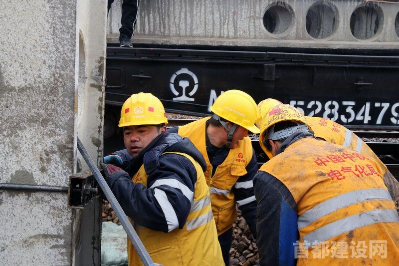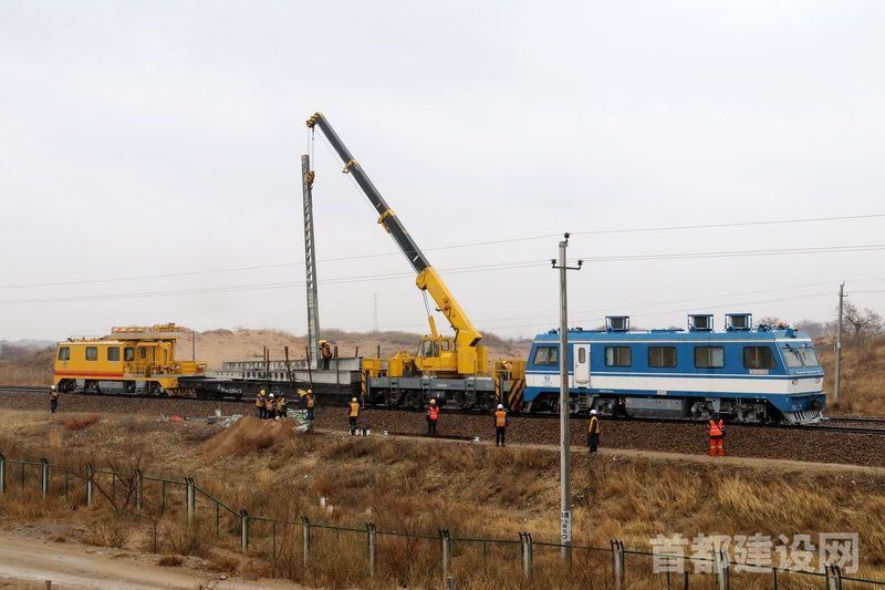 施工人员冒雨用轨道车进行接触网支柱组立 ■企业/供图