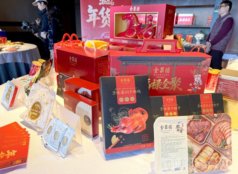 全聚德年货节30余款产品焕新亮相 2026年农历新春将至,全聚德集团年货节推出30余款产品,其中新品占比达50%,涵盖家宴礼盒、白酒礼盒、熟食礼盒、卤味零食等多个品类,全方位满足家宴、礼赠、企业福利等多元化场景需求。针对高端家宴等消费场景,全聚德集团推出多款臻品家宴礼盒,内含全聚德烤鸭及全聚德、四川饭店、丰泽园包装食品和仿膳面点四大品牌的产品。、招牌产品全聚德手工片制烤鸭礼盒4.0版,传承国家级非遗挂炉烤鸭技艺,经31道工序,以果木明火慢烤。鸭皮均匀枣红、薄脆如纸,鸭肉鲜嫩多汁,带果木清香。由全聚德挂炉烤鸭技艺传承人手工片制,每片薄厚均匀、皮肉相连,并配套荷叶饼、甜面 新闻 2026年01月22日 0 点赞 0 评论 4 浏览